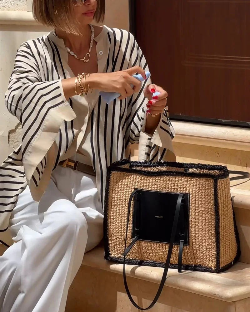 Découvrez l'élégance et la légèreté avec notre chemise à rayures décalées. Conçue pour mettre en valeur toutes les morphologies, elle flatte la silhouette tout en offrant un confort absolu. Polyvalente et chic, elle peut être portée avec un pantalon, un short ou ouverte sur un débardeur pour un style personnalisé.