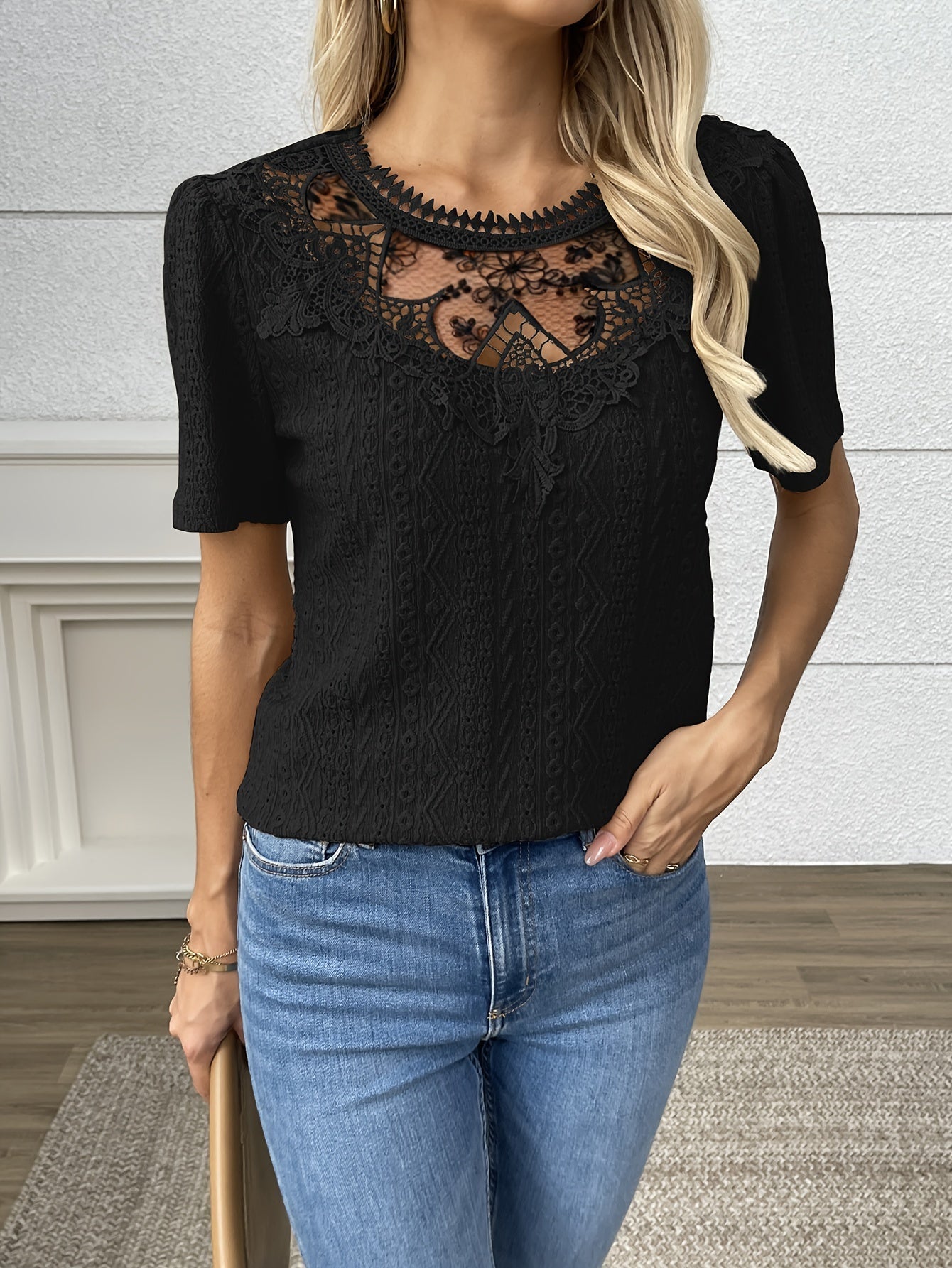 Chemisier à col ras du cou - détails en dentelle et manches courtes