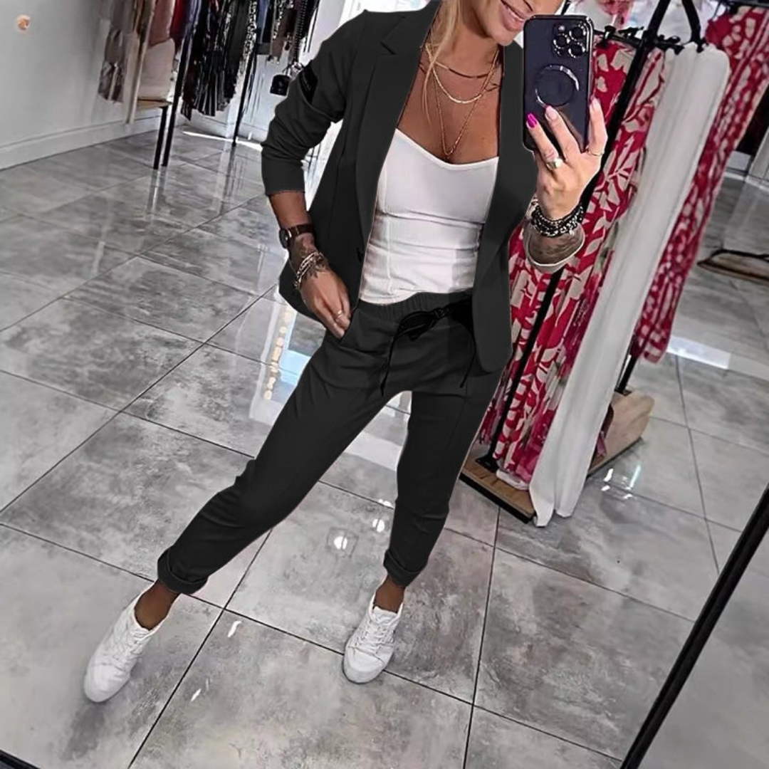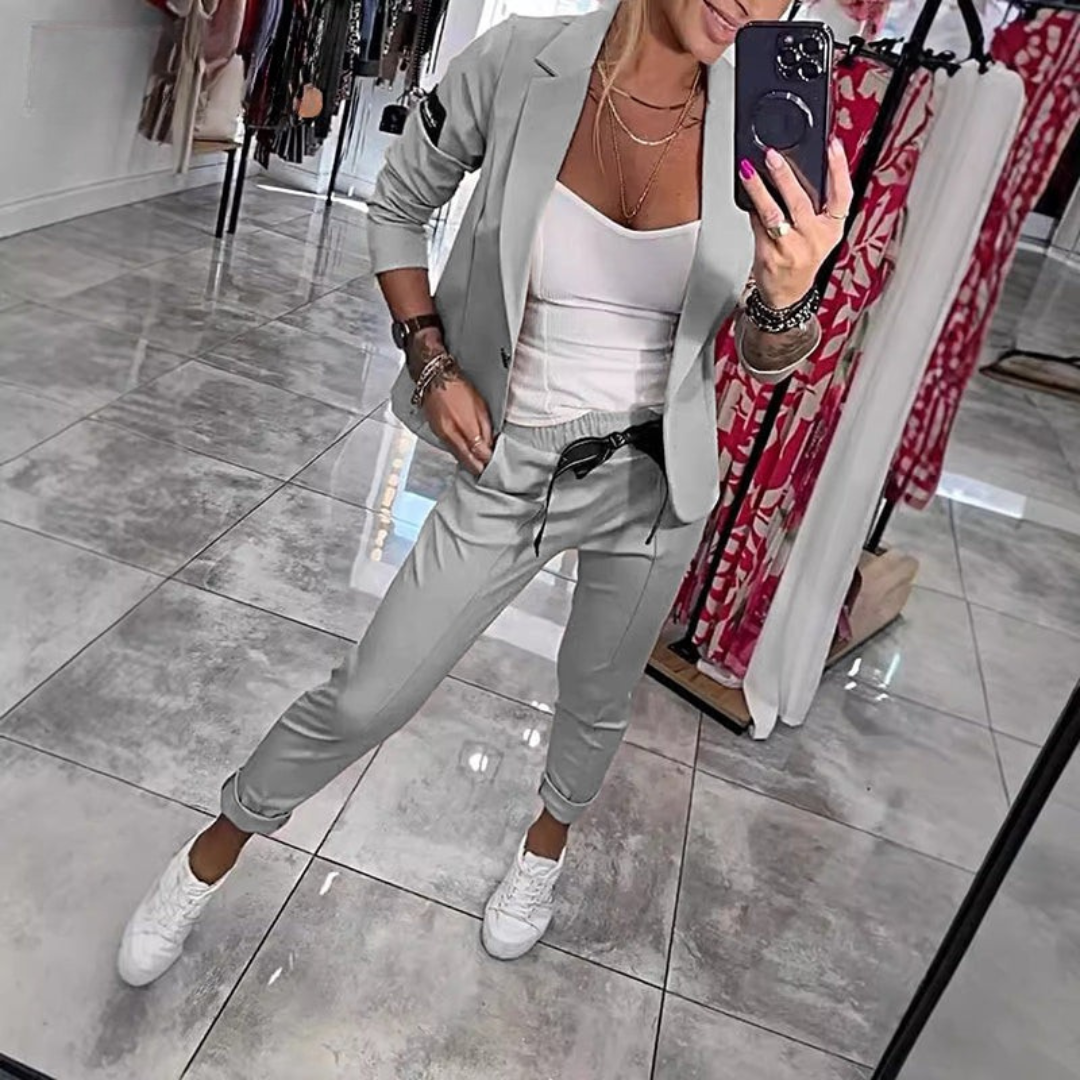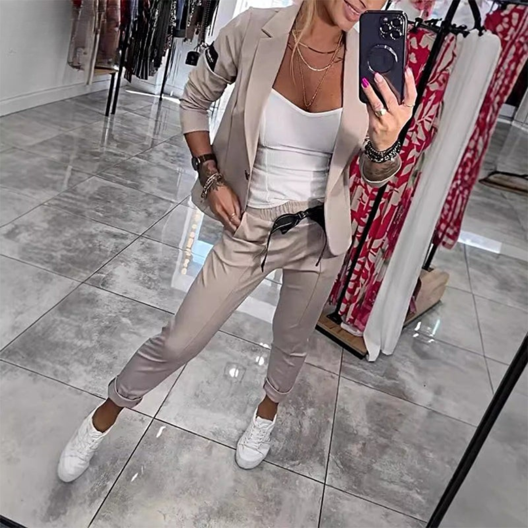 Cet ensemble chic apporte une touche moderne et féminine à votre tenue quotidienne. La veste légère et le pantalon confortable créent une silhouette harmonieuse, parfaite pour le bureau comme pour les sorties. Le pantalon à taille élastique assure un confort total et le blazer ajoute une note élégante. Porté avec un débardeur simple et des baskets, cet ensemble offre une allure soignée et décontractée.