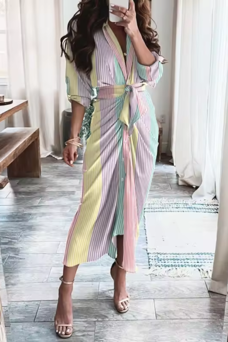 Entrez dans une sophistication sans effort avec cette robe chemise ajustée, conçue pour flatter toutes les courbes. Conçue dans des matières douces, naturelles et délicates, cette robe présente un superbe imprimé coloré qui ajoute une touche de personnalité à votre look. La fermeture à lacets à la taille et la silhouette ajustée créent une allure sophistiquée et sûre d'elle, idéale pour les femmes actives et soucieuses de la mode.